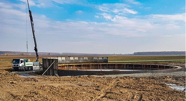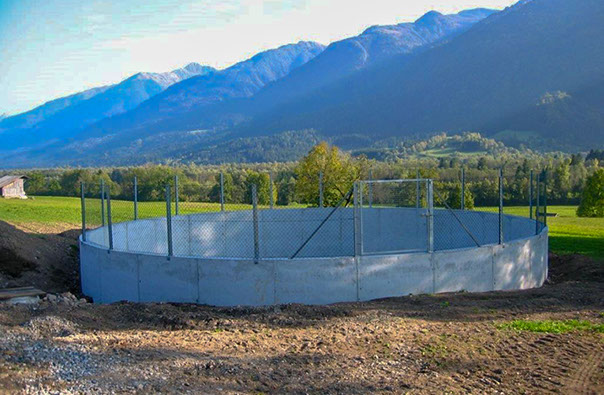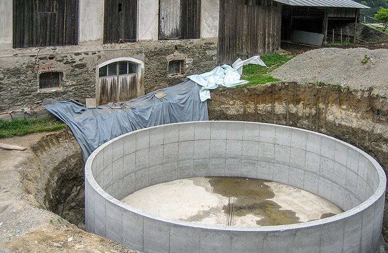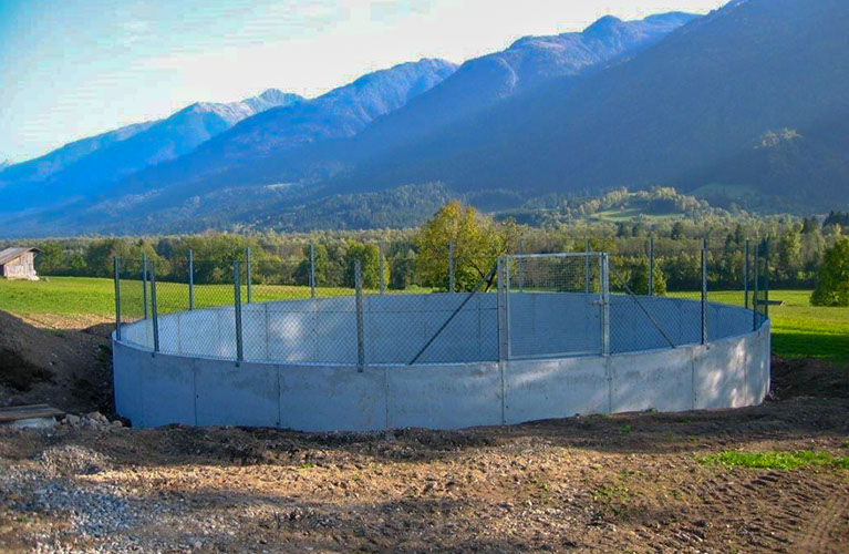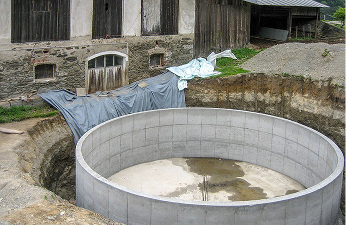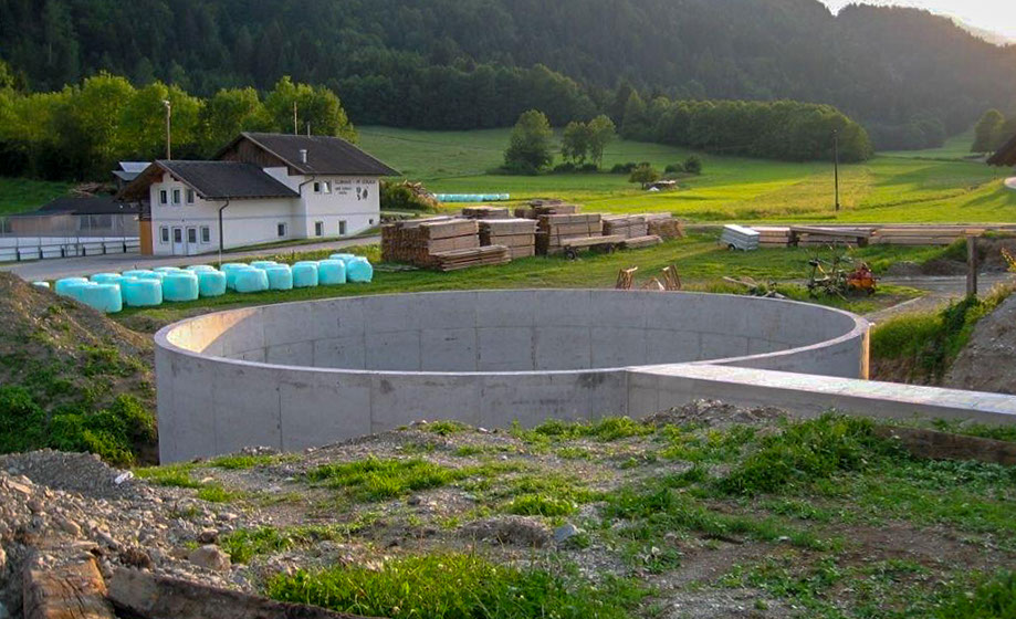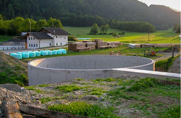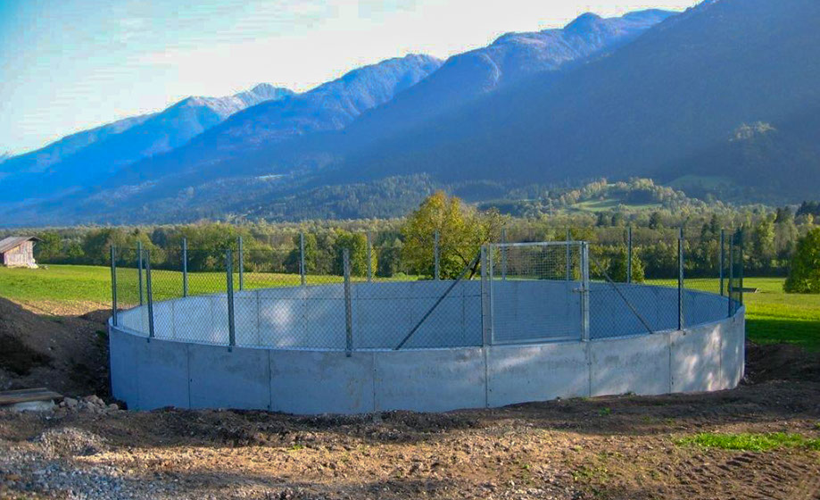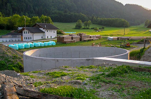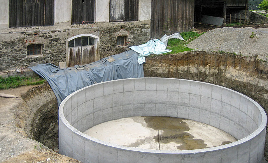 Für die Gülletechnisierung (Homogenisierung) sind Rundbehälter die eindeutig beste Lösung. Rundbehälter in Stahlbeton sind sehr wirtschaftlich und können zudem als Tiefbehälter und bei Hanglagen ausgeführt werden..